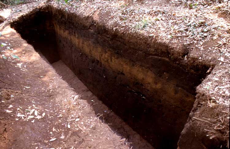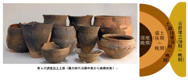 測量の結果、大小4基の盛土遺構が半弧を描くように配列されていることが判明した。また、トレンチ発掘の結果、盛土周辺からは後期中葉から晩期前葉の土器が大量に出土した。次に、遺跡の東側の谷が後期から晩期の土器を大量に含む土で埋め立てられていることがわかった。谷頭および斜面にトレンチを入れた結果、ローム質土が分厚く堆積していることが確認され、縄文人による埋め立て工事の痕跡と判断されたのである。一方、中央窪地は黒色土が堆積し、出土土器は少なく、晩期のものがほとんどである。住居跡などの遺構は盛土下や盛土外側にはあるが中央窪地には見つからないことから、中央窪地は広場のような空間で、その周囲にムラが営まれていた様子がうかがえた。そして東側の斜面を埋め立て、平らな面を広げながら環状に盛土を造り、さらにその外側に土器を捨てていたと考えられる。
