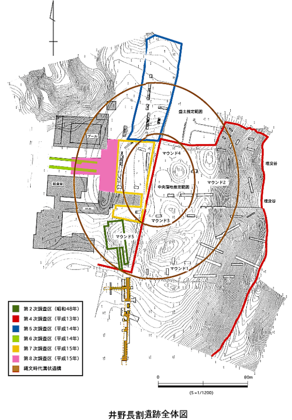 南側盛土(マウンド5)の調査。盛土下から後期中葉の住居跡2軒、後期前葉の住居跡1軒。 また、盛土南裾から後期中葉の土器塚検出。異形台付土器出土。 | 清水潤三・鈴木公雄 1974 『井野長割遺跡概報』佐倉市教育委員会 |